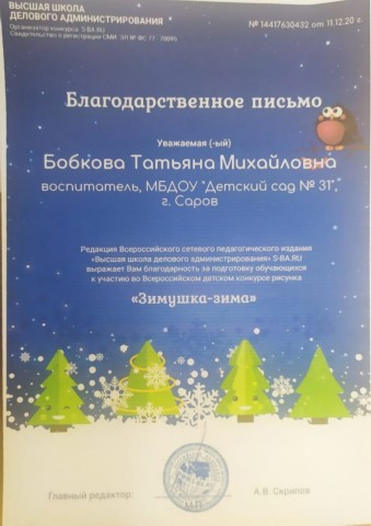Благодарственное письмо за подготовку обучающихся к Всероссийскому конкурсу "Зимушка-зима"